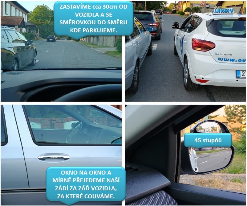 - Okno na okno: Mírně přejedeme naší zádí za záď vozidla, za které couváme.