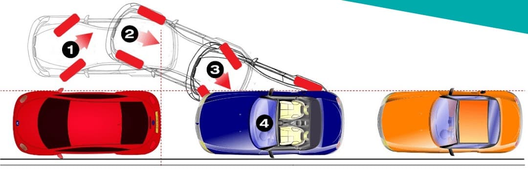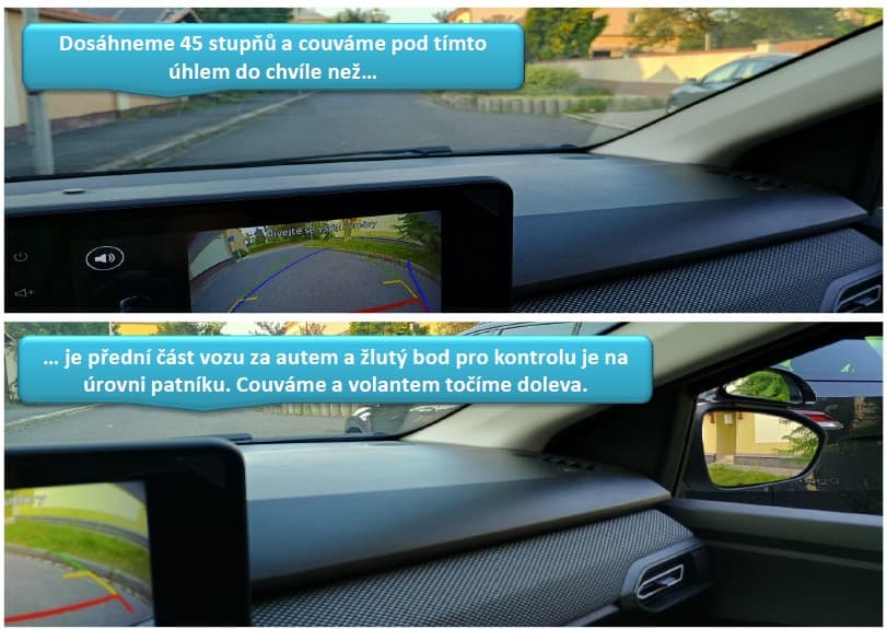- Úhel 45 stupňů: Dosáhneme 45 stupňů a couváme pod tímto úhlem do chvíle, než je přední část vozu za autem a žlutý bod pro kontrolu je na úrovni patníku.